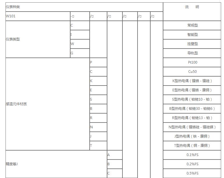 2、設(shè)定值參照表選型舉例:W1010-ZP1OSBU-023M0-150W10裝配型溫度傳感器,感溫元件為熱電阻Pt100,BJ精度,固定螺紋連接,直徑16的不銹鋼保護(hù)管,防水接線盒,插入深度150